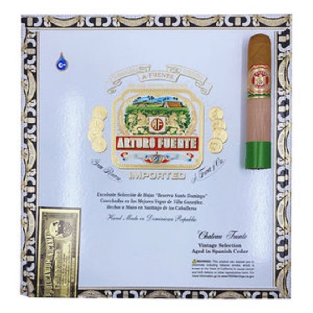 Arturo Fuente Chateau Fuente is a smaller cigar that has a silky, light brown Connecticut shade wrapper, and aged Dominican filler tobaccos from the legendary Fuente farm. Already rich, nutty, and smooth, the aromatic cedar sleeve covering this cigar, makes them even more mellow and delicious. An excellent classic in a smaller size!